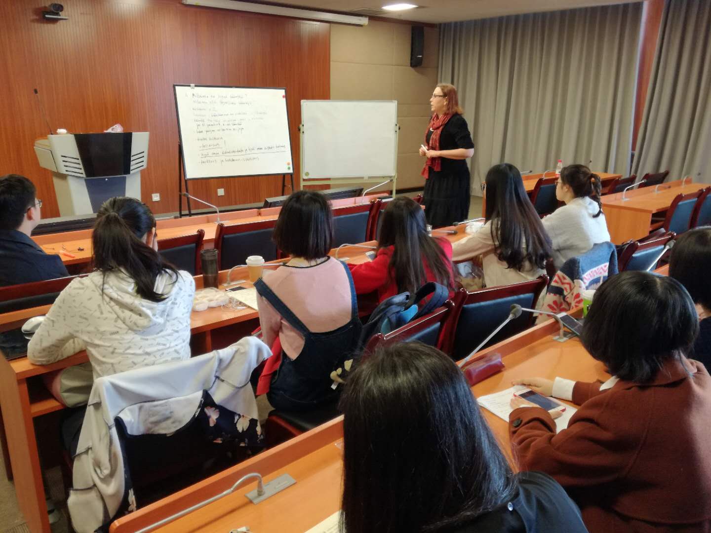 3月19日至3月30日,应365英国上市官网芬兰研究中心邀请,芬兰翻译专家莉娜· 沃科(RiinaVuokko)访问我校,为芬兰语班大四学生进行为期两周的翻译集中讲学授课。