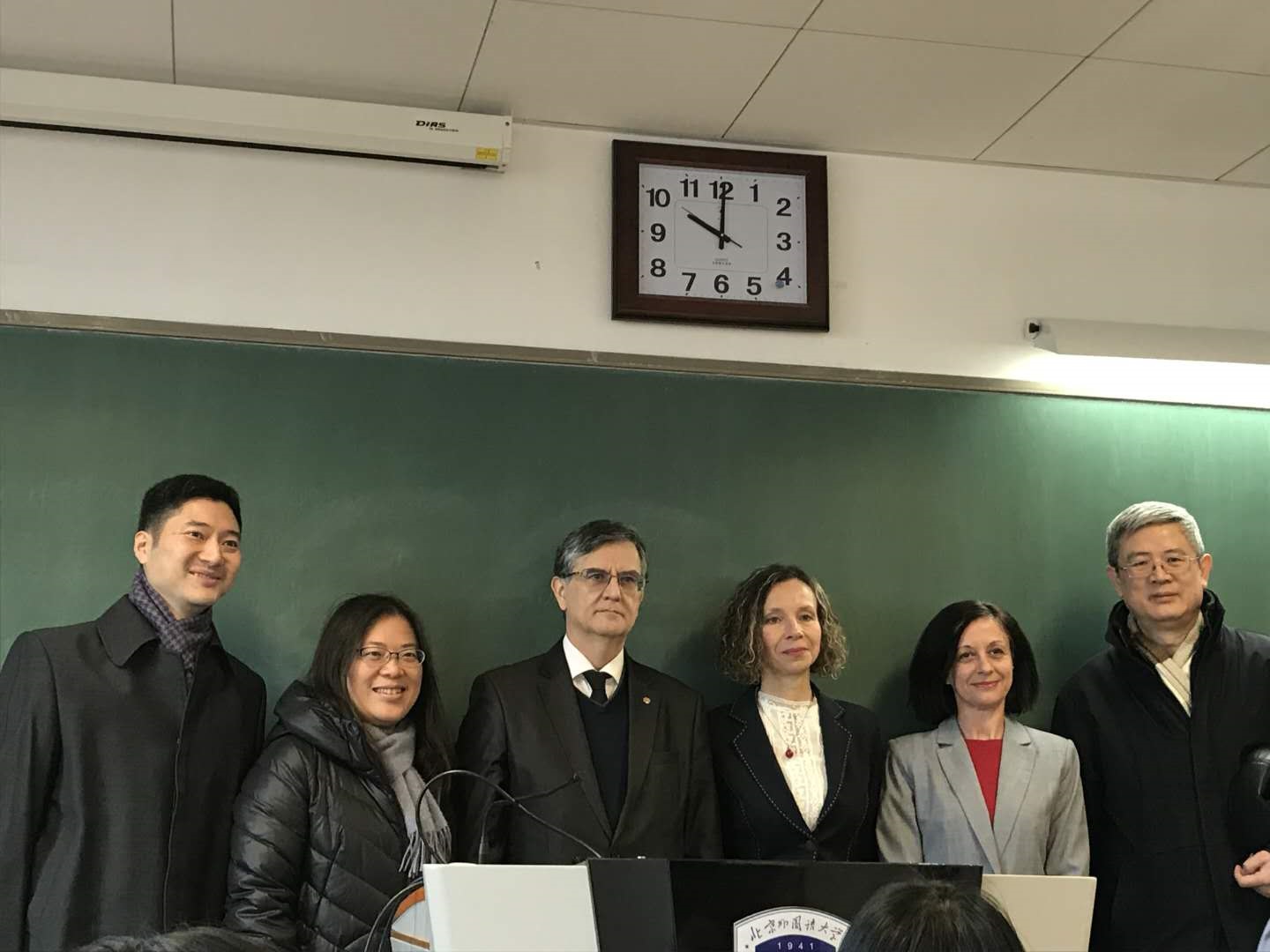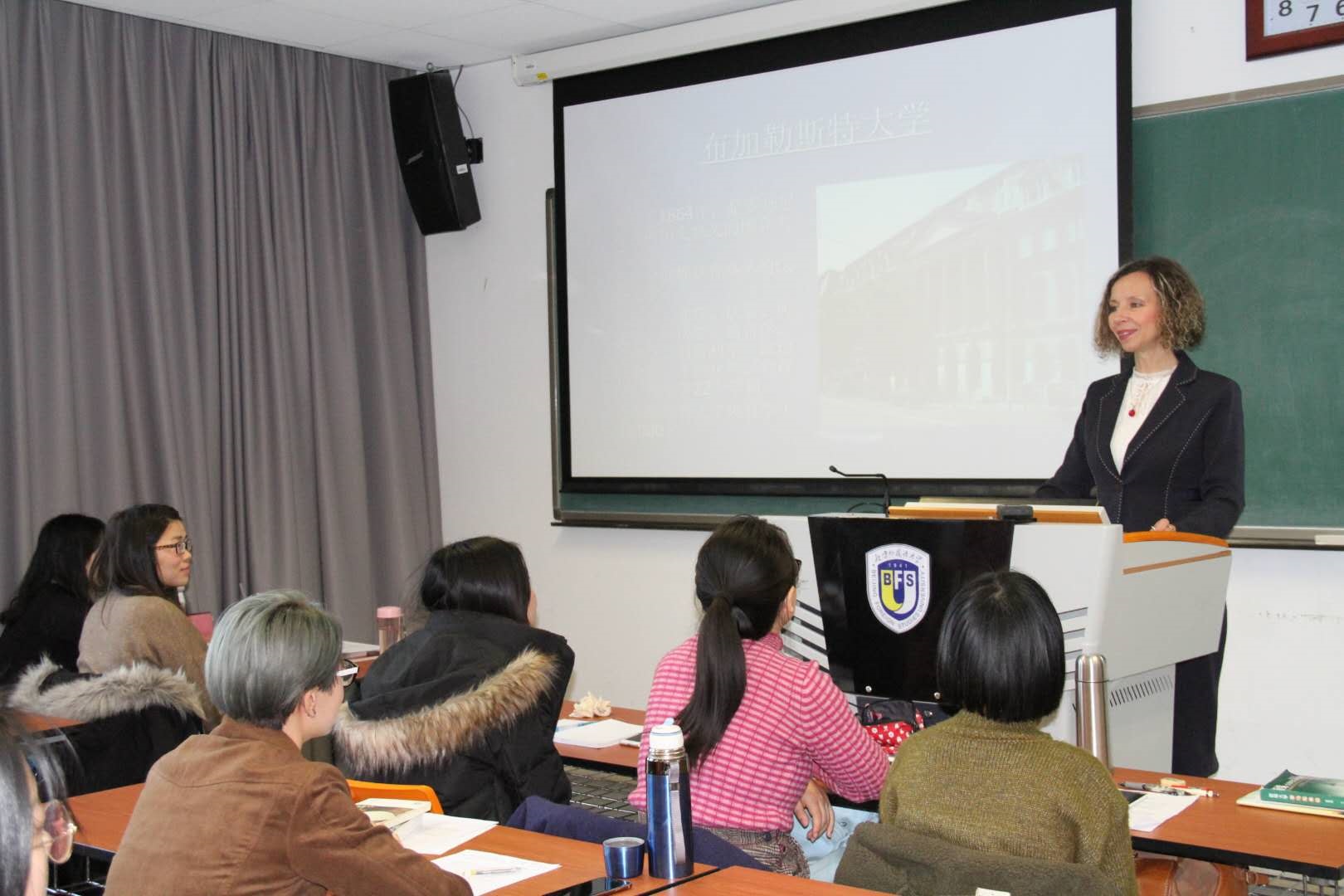 会见前,在北外罗马尼亚研究中心的组织安排下,代表团一行与北外罗马尼亚语专业师生进行了交流,布大孔子学院外方院长、布加勒斯特大学外语系汉语教研室主任白罗米(Luminița BĂLAN)向大四学生做了《中国文学在罗马尼亚的传播》的专题讲座,为北外师生带来了许多新资讯。罗语专业学生纷纷提问并发言,和客人们互动频繁,气氛活跃。