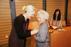 授勋仪式上,林戴安大使将北极星勋章挂到两位教授胸前,并向他们颁发了由瑞典国王卡尔十六世·古斯塔夫亲笔签名的证书。瑞典语班学生演唱圣诞歌曲,向两位前辈表示祝贺。