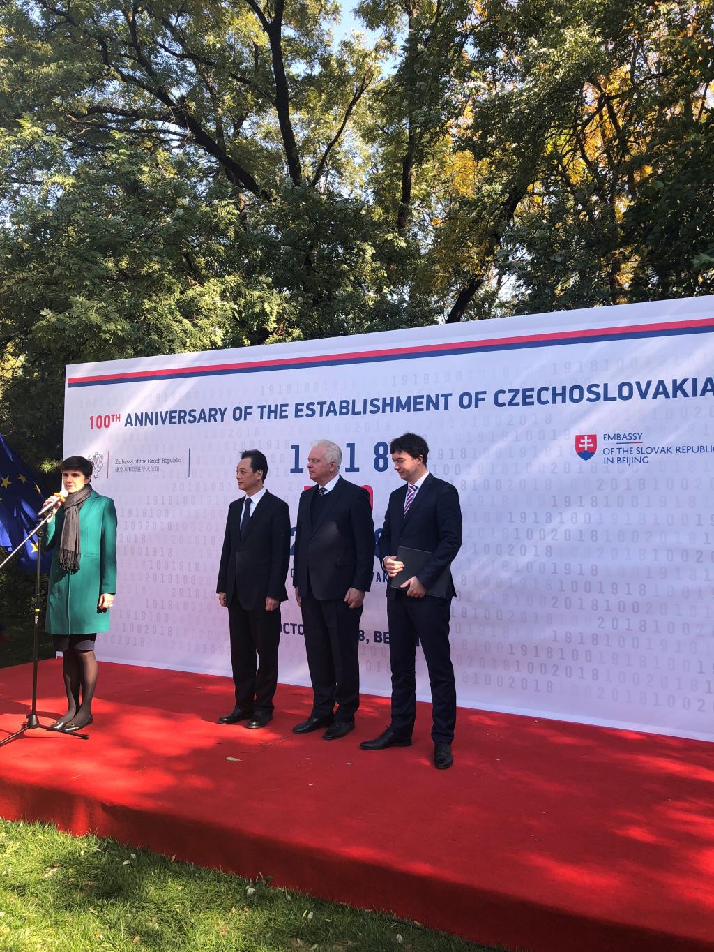 中国外交部副部长王超应邀参加此次活动。捷克共和国外交部副部长卢卡什·考茨基及斯洛伐克共和国驻华大使杜尚·贝拉出席活动并致辞。贝拉大使及考茨基副部长先后就捷克共和国与斯洛伐克共和国百年来的交流发展及中斯、中捷的良好关系作了讲话。贝拉大使及考茨基副部长表示,明年将迎来前捷克斯洛伐克共和国与中华人民共和国建交70周年,斯方与捷方期待在未来继续加强同中方的合作。台下的同学们认真聆听,愈发清晰地认识到其身所肩的历史使命并激荡起庄严的责任感。