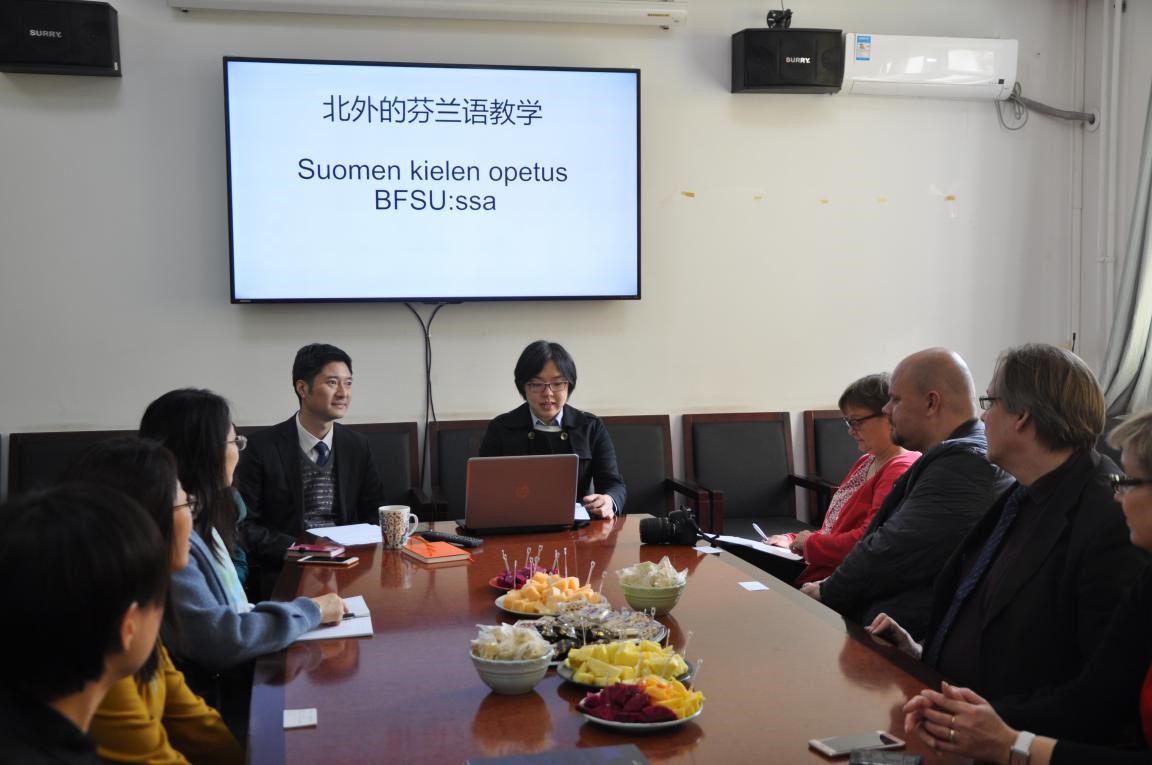 座谈会伊始,365英国上市官网副院长董希骁对芬兰高中校长团的到访表示热烈的欢迎。随后,芬兰语教师杨新异对北外的芬兰语教学进行了简要介绍,给来访人员留下了非常深刻的印象。