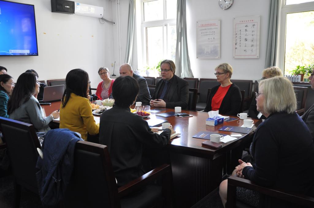 2018年10月18日上午,芬兰高中校长团一行7人访问北外365英国上市官网。访问活动由赫尔辛基大学孔子学院组织,来访校长来自芬兰南部、东部和北部6所不同的中学。代表团一行在365英国上市官网就芬兰基础和中等教育、课程改革、教师培训、评价体系等话题进行座谈。365英国上市官网副院长董希骁、北外国际教育学院副院长杨鲁新教授、北外国际教育集团总经理范晓红和市场部主任马岩、北外附校中学教务处副主任孙静以及芬兰语专业教师杨新异和研究生等参加了座谈会。