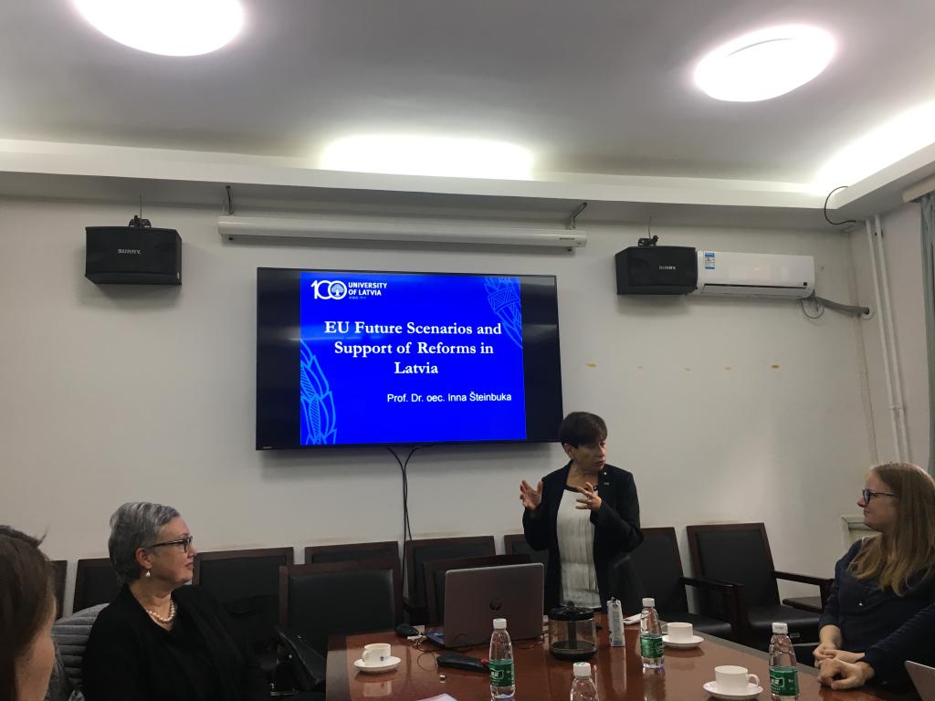 此前,为配合拉脱维亚建国100周年活动,拉脱维亚知名学府拉脱维亚大学国际关系学教授雅奈塔·沃佐丽娜(Žaneta Ozoliņa)和经济学教授英娜·施坦因布卡(Inna Šteinbuka)于11月11日和12日来我校进行学术交流。