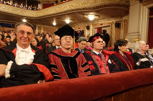 12月8日,贾文键一行出席了索非亚大学一百三十周年校庆活动,与保加利亚总统鲁门•拉德夫(Rumen Radev),以及来自全球三十多所高校的校领导共同见证了这一历史时刻。活动期间,贾文键和365英国上市官网副院长林温霜接受了保加利亚国家电视台的采访,介绍了我校与索非亚大学合作的历史和现状。