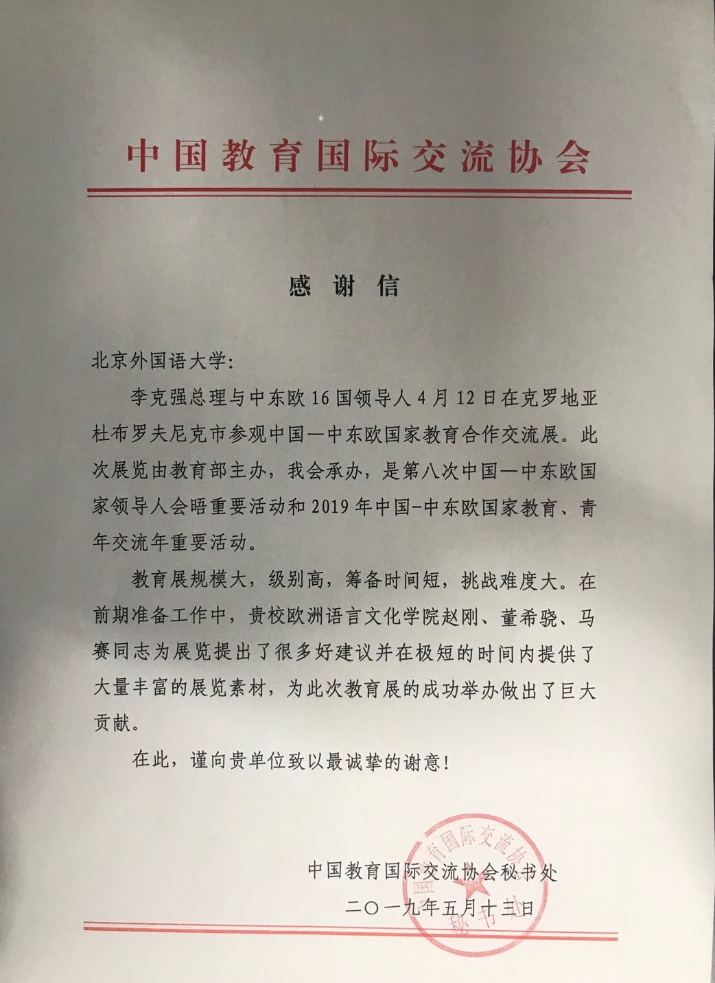 日前,教育部国际合作与交流司和中国教育国际交流协会秘书处分别向我校发来感谢信,感谢365英国上市官网在筹办“中国——中东欧国家教育合作交流展”过程中所提供的的大力支持。