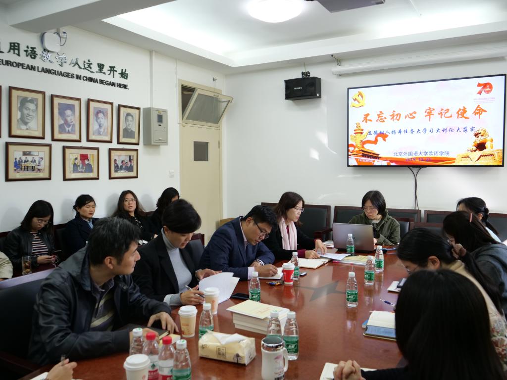 随后,大家从不同的层次和角度展开了积极的讨论。老师们不仅从理论层面解读了主题教育活动对党员、老师的指导作用、对于“德”的理解、“德”对不同的职业和身份提出不同的要求等;还结合工作实际,分别从全院工作部署层面以及具体教学工作层面深入探讨如何“立德树人”以及何为教师的“初心”和“使命”。丁超教授用真实而感人的故事阐释了初心和使命就是一种职业精神。“不忘初心、牢记使命”主题教育不仅仅是学习文件,更重要的是落实到行动中,上好每一堂课,用自己的言行影响教育学生。赵刚院长以易丽君教授为例,说明坚持的重要性。他结合刚刚出访中东欧三国体会,说明教师的使命就是为国家培养战略人才。目前国内外形势的剧烈变化对人才的培养带来了全新的挑战,希望全体教师不断丰富自己的知识贮备,提高战略思维,担当为国育才这一重要使命。杨文围绕“坚持立德树人,加强大学生思想政治工作”谈了自己的看法,指出坚持立德树人要始终全面加强党的领导, 充分发挥好课堂教学主渠道作用,加强师德师风建设,构建三全育人体系。
