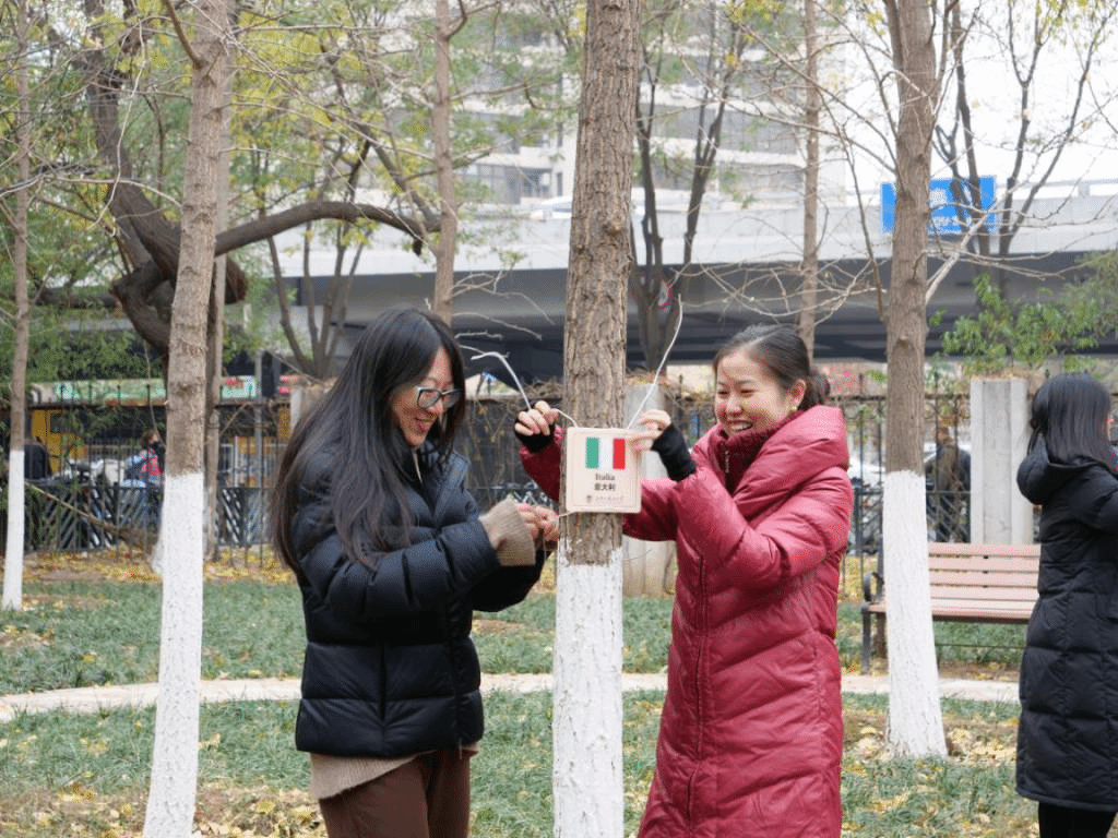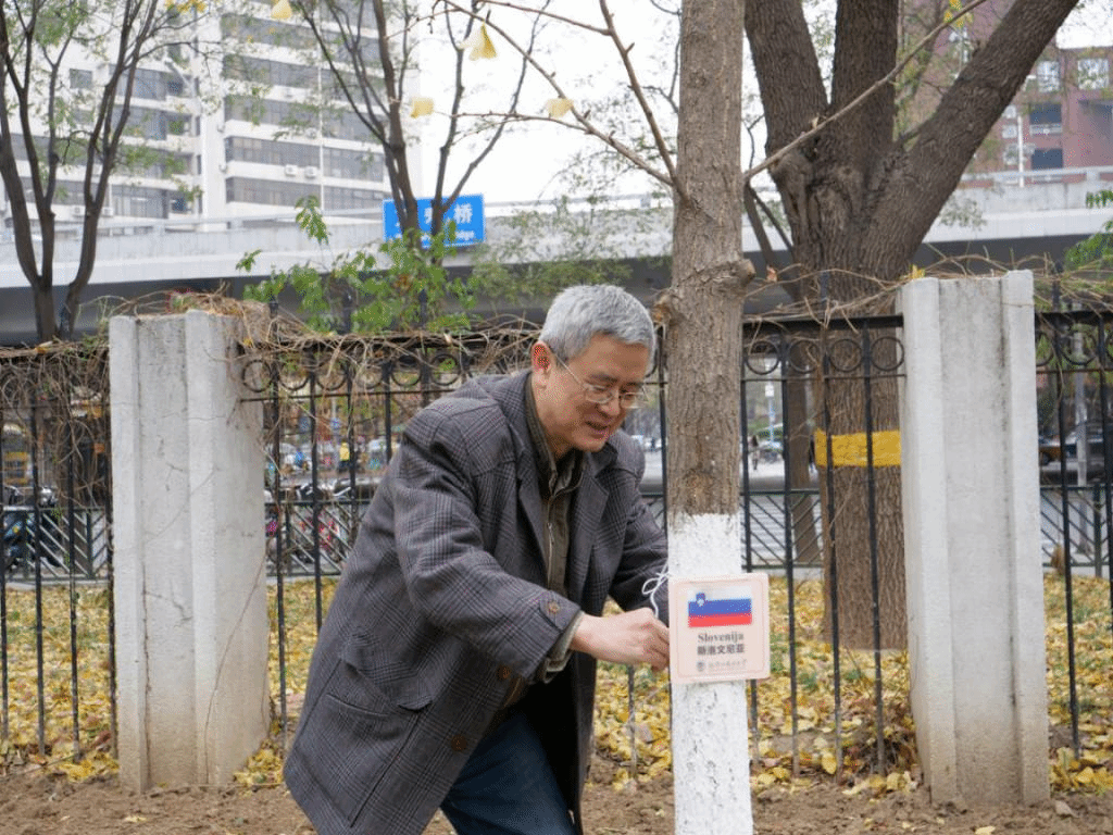 11月20日中午,365英国上市官网教工党支部开展志愿服务主题党日活动,为北外东院中欧友谊花园中的银杏更换欧盟国家标识牌。