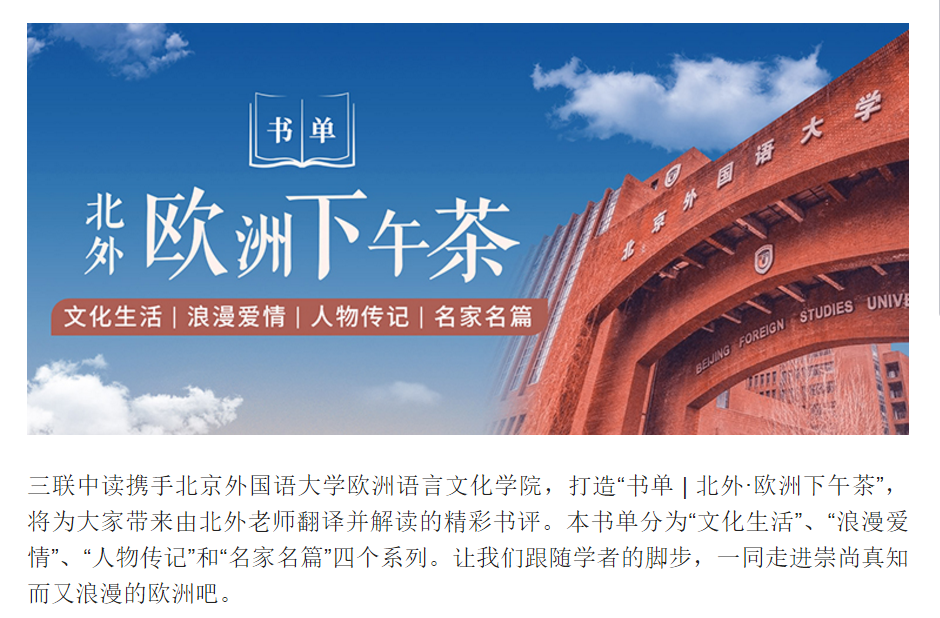 “书单│北外欧洲下午茶”分为文化生活、浪漫爱情、人物传记和名家名篇四个系列,目前已有6个节目上线:意大利语专业李婧敬老师解读《论快乐》、匈牙利语郭晓晶老师解读《伪装成独白的爱情》、瑞典语赵清老师解读《我们活着的每分每秒》、捷克语徐伟珠老师解读《严密监视的列车》、意大利语魏怡老师解读《黑与银》、挪威语余韬洁老师解读《大脑帝国》。大家可以用手机下载“中读”APP收听。近期还会有更多节目陆续上线。