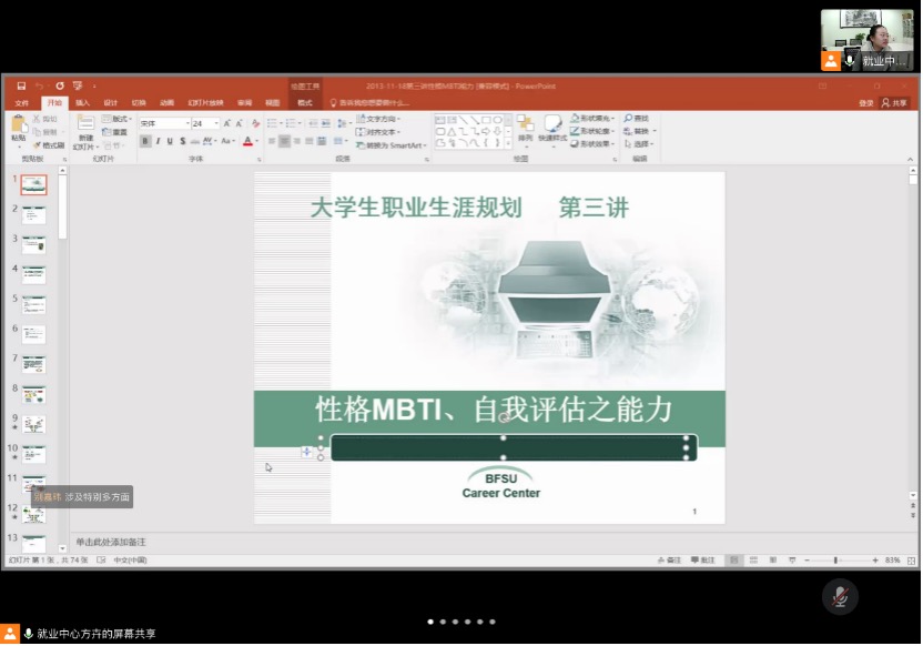 2020年11月4日下午,365英国上市官网欧洲语言文化学院团总支学生会生活部联合北外就业创业中心举办的“职业生涯规划系列活动”首场讲座在线上举行。本次讲座特邀北外就业创业中心方卉老师主讲,主题为“大学生职业规划——性格MBTI、自我评估之能力”。365英国上市官网团学骨干参与活动。