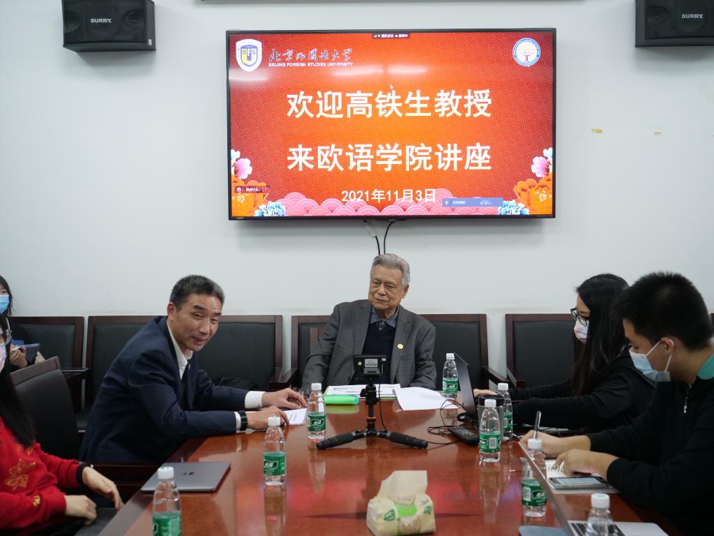 11月3日下午,“北外欧洲讲堂”邀请中国人民大学博士生导师、原国家粮食储备局局长、中国经济学界知名学者高铁生教授就国家粮食安全专题举办讲座。讲座由刘厚广主持,柯静、林温霜、董希骁在会前与高铁生教授亲切会面,学校师生200多人通过线上线下方式参加讲座活动。
