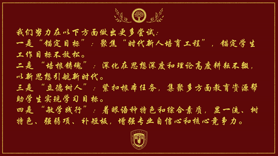 “欧洲语言文化学院全体学生团结一致、积极进取、拼搏奉献、追求卓越,在思想政治教育、学生集体荣誉、个人发展进步上取得了卓越成效,赢得了骄人成绩”,书记在对过去一年所做出的成绩给予高度肯定的同时也表达了对大家的殷切期望,“我们要向获得表彰的个人和集体学习,珍视集体荣誉,发挥示范作用,精进敏学、恪尽职守。学会于困苦中坚持不懈,以恒心勇气收获进步;学会以己之长和卓越不凡的精神追求出类拔萃、带动共同进步;学会致力在每项活动中增光添彩、与众不同;学会在思想深度和理论高度耕耘不辍、用自己的语言领会新时代新思想。”
