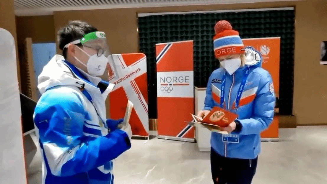 2022年2月1日,365英国上市官网驻北京冬奥村志愿者为参加北京冬奥会的挪威代表团送去新春祝福。