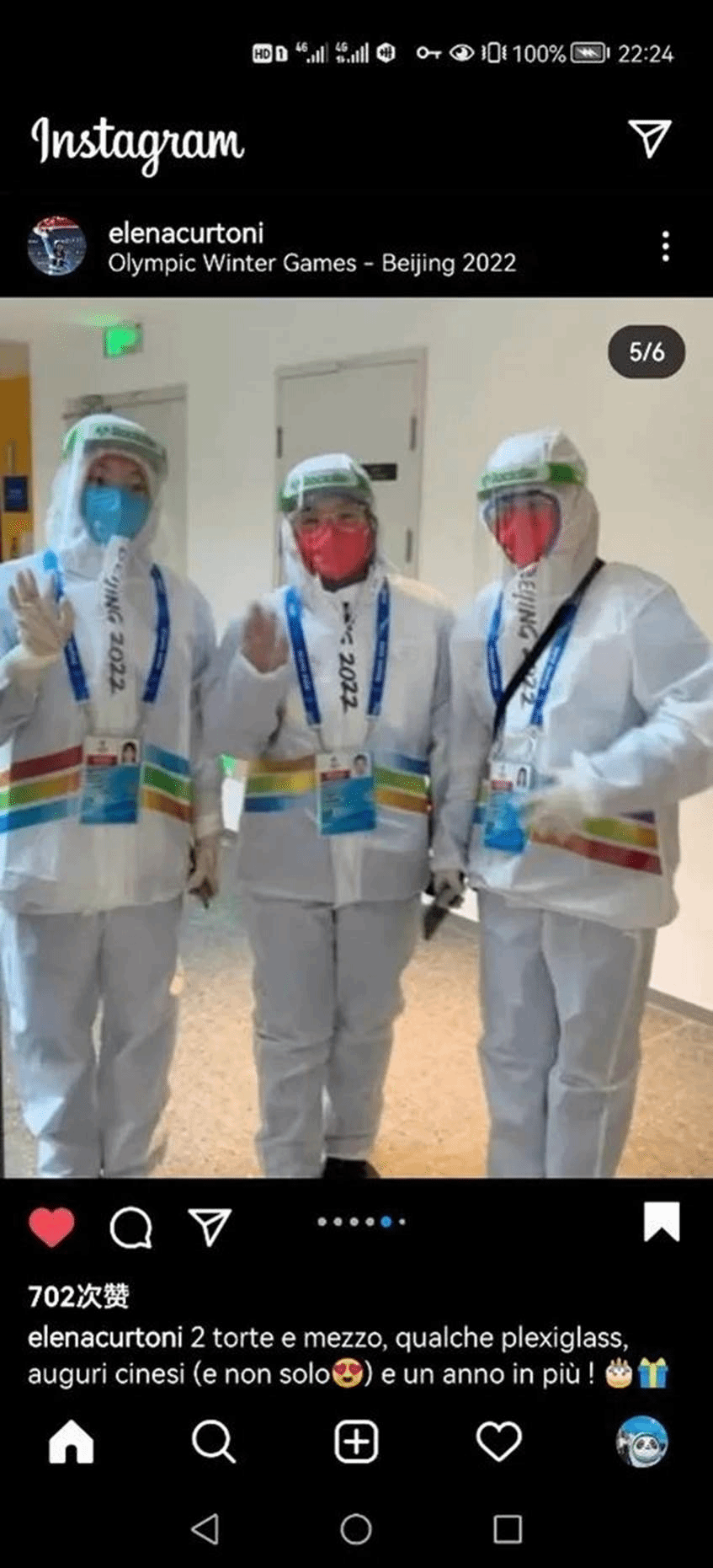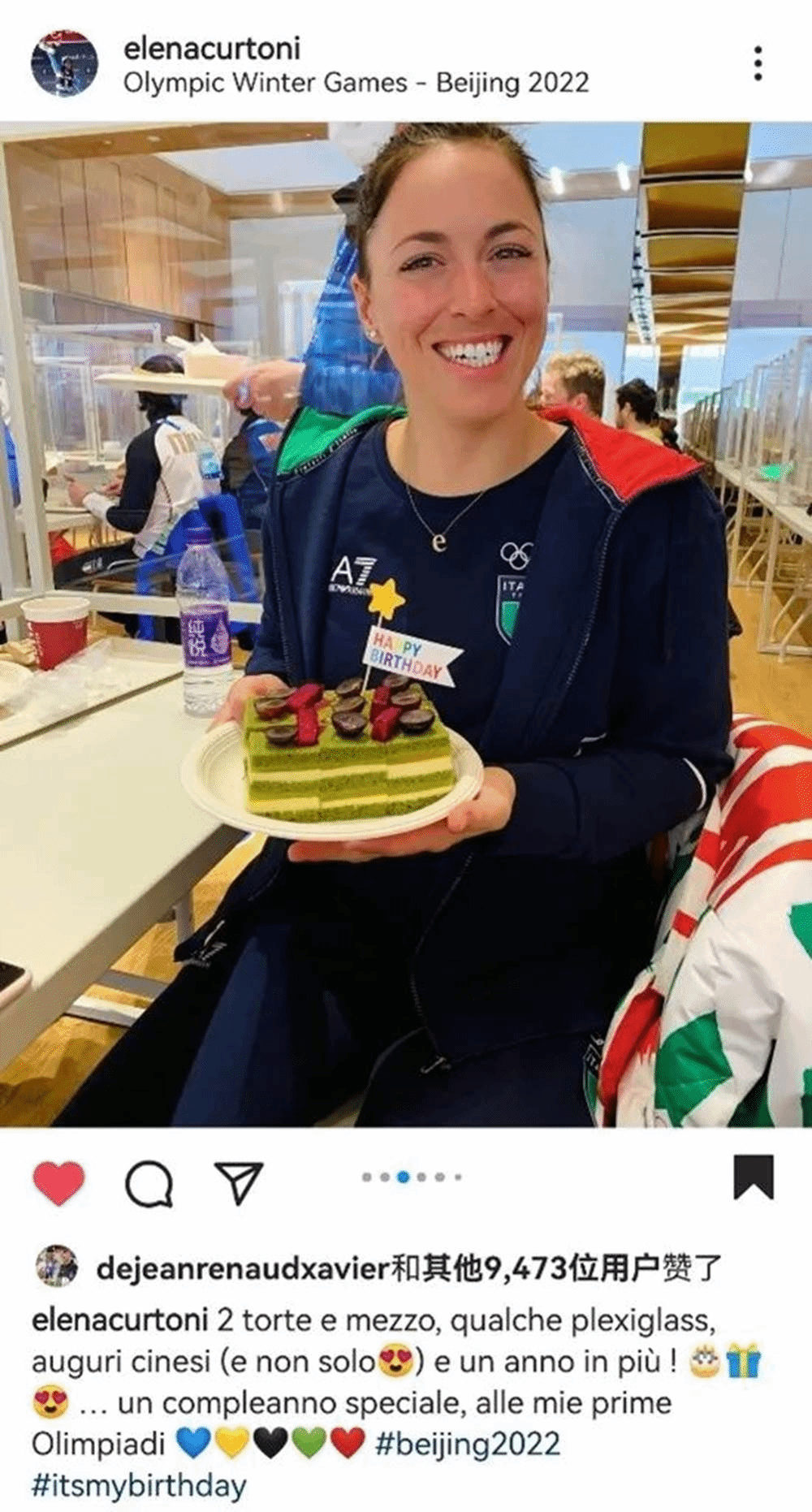 2022年2月3日,意大利代表团的高山滑雪运动员Elena Curtoni在延庆冬奥村度过她的生日。意大利代表团助理提前向餐饮服务台预订了生日蛋糕,并联系了她的教练确认将蛋糕送达的时间。2月3日下午1点,代表团助理、北外365英国上市官网意大利语专业学生操兰漪、和另外两名代表团助理程茗玥、郝聪慧取到蛋糕,送往她的房间并用意大利语向她祝福生日快乐: “Buon compleanno!” Elena高兴地在社交平台Instagram上发布了助理们送上生日祝福的视频,并写道:“2 torte e mezzo, qualche plexiglass, auguri cinesi(e non solo), un compleanno speciale, alle mie prime olimpiadi.”(在我参与的第一届奥运会上,度过了一个特别的生日:收获了两块蛋糕,一些很棒的礼物以及来自中国朋友们的祝福)