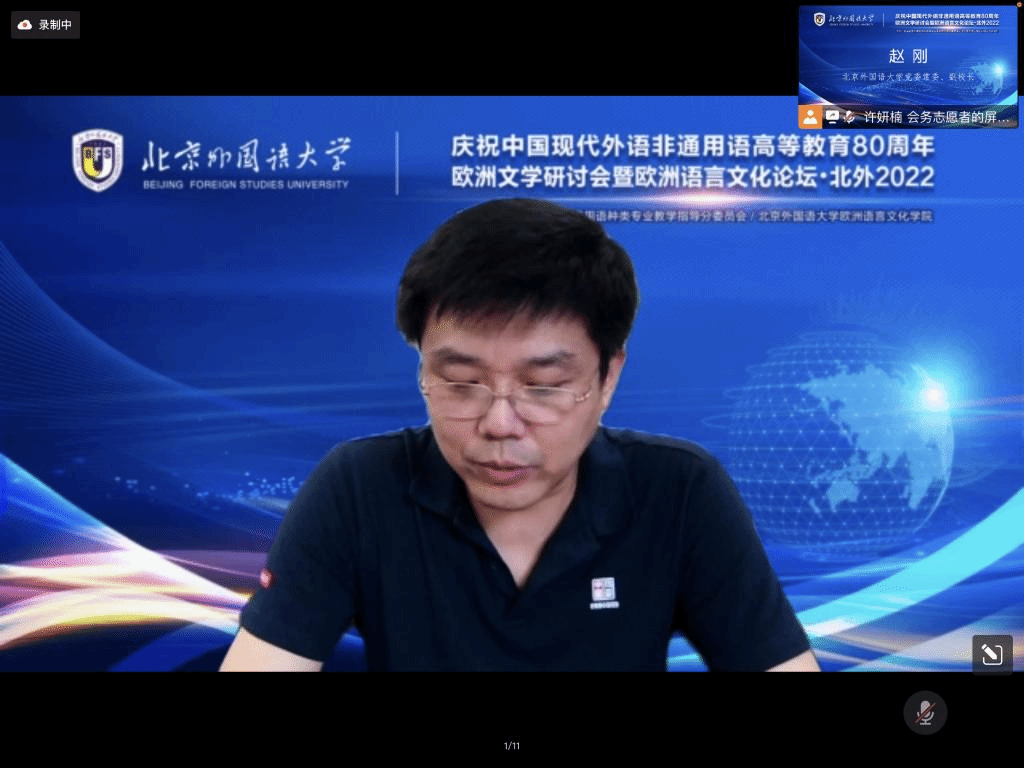 赵刚在致辞中回顾了中国非通用语80年发展历程。他指出, 伴随“一带一路”倡议实施进程,推动构建“人类命运共同体”,加强中外人文交流,外语院校大有可为。在世界格局面临百年未有之大变局背景下,中国非通用语教育面临新的机遇和挑战,人文交流的重要性更加凸显。“欧洲文学研讨会暨欧洲语言文化论坛”连续举办了五届,有助于加深中国社会对欧洲语言多样性和文化多样性的了解,有助于加深中国社会对欧洲复杂形势历史经纬的了解,有助于中国欧洲非通用语教育事业质量的整体提升。