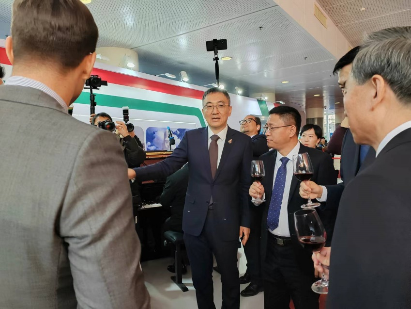 杨朝杰校友为领导和嘉宾介绍匈牙利馆的展览内容 许衍艺摄