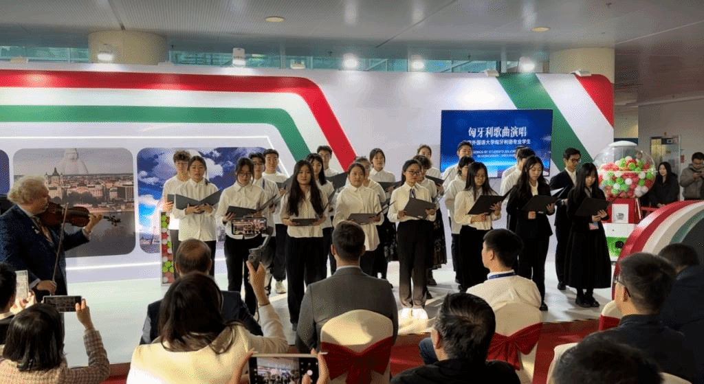 北外匈语专业学生与世界知名小提琴家罗比·拉卡托斯联袂,演绎匈牙利民歌,把会场气氛推向高潮,吸引大批观众驻足观看。